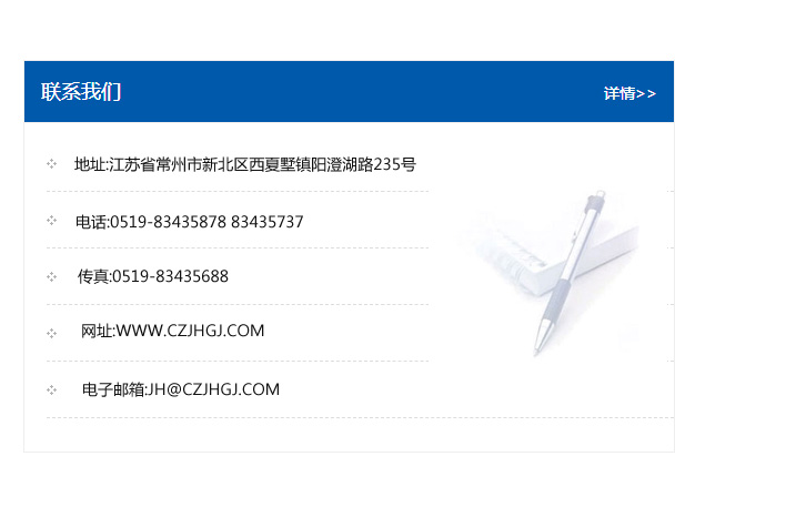 地址:常州市新北區友邦商務大廈1幢16、17層  電話:0519-85101652  傳真:0519-85112595  郵編:213022  網址:www.cz-jiayue_cn.jianjidian.com  郵箱:xiajifengaa@163.com